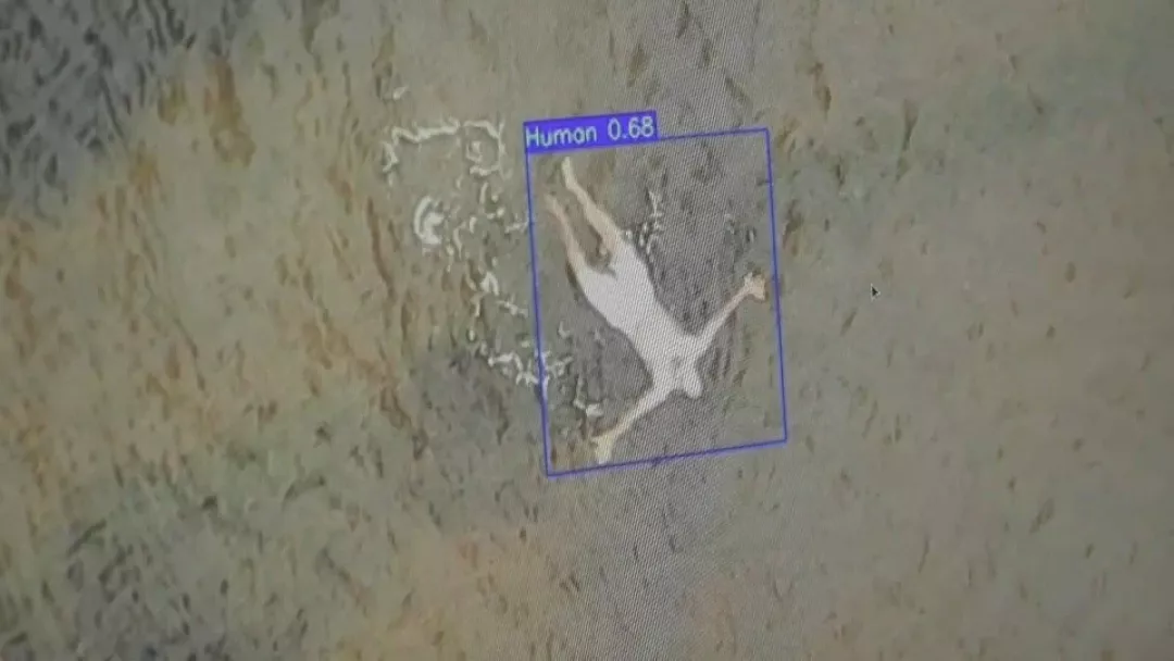 El cuadricóptero despega y vuela de forma autónoma, rastreando metódicamente un área predefinida. Está equipado con una cámara térmica que envía datos a una unidad de procesamiento de IA.